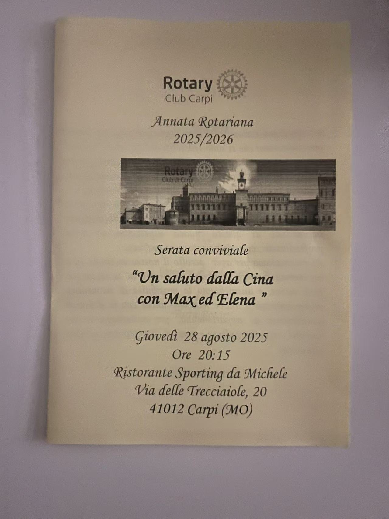 A fellowship dinner entitled “A Greeting from China with Max and Elena” was organised by the Rotary Club of Carpi, Italy on Thursday August 28th, at the Sporting by Michele Restaurant in Carpi