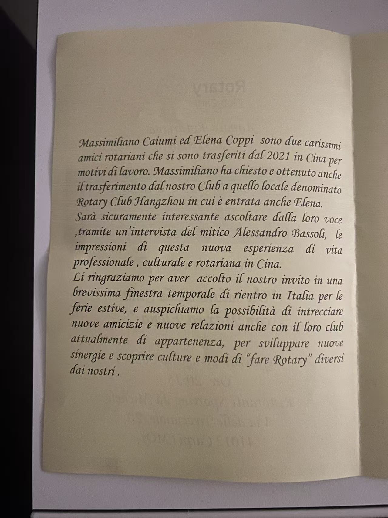 Massimiliano Caiumi (Max) 和 Elena Coppi 自 2021 年起因工作原因居住在中国,他们是卡尔皮扶轮社的两位好友,在意大利度过了几天暑假