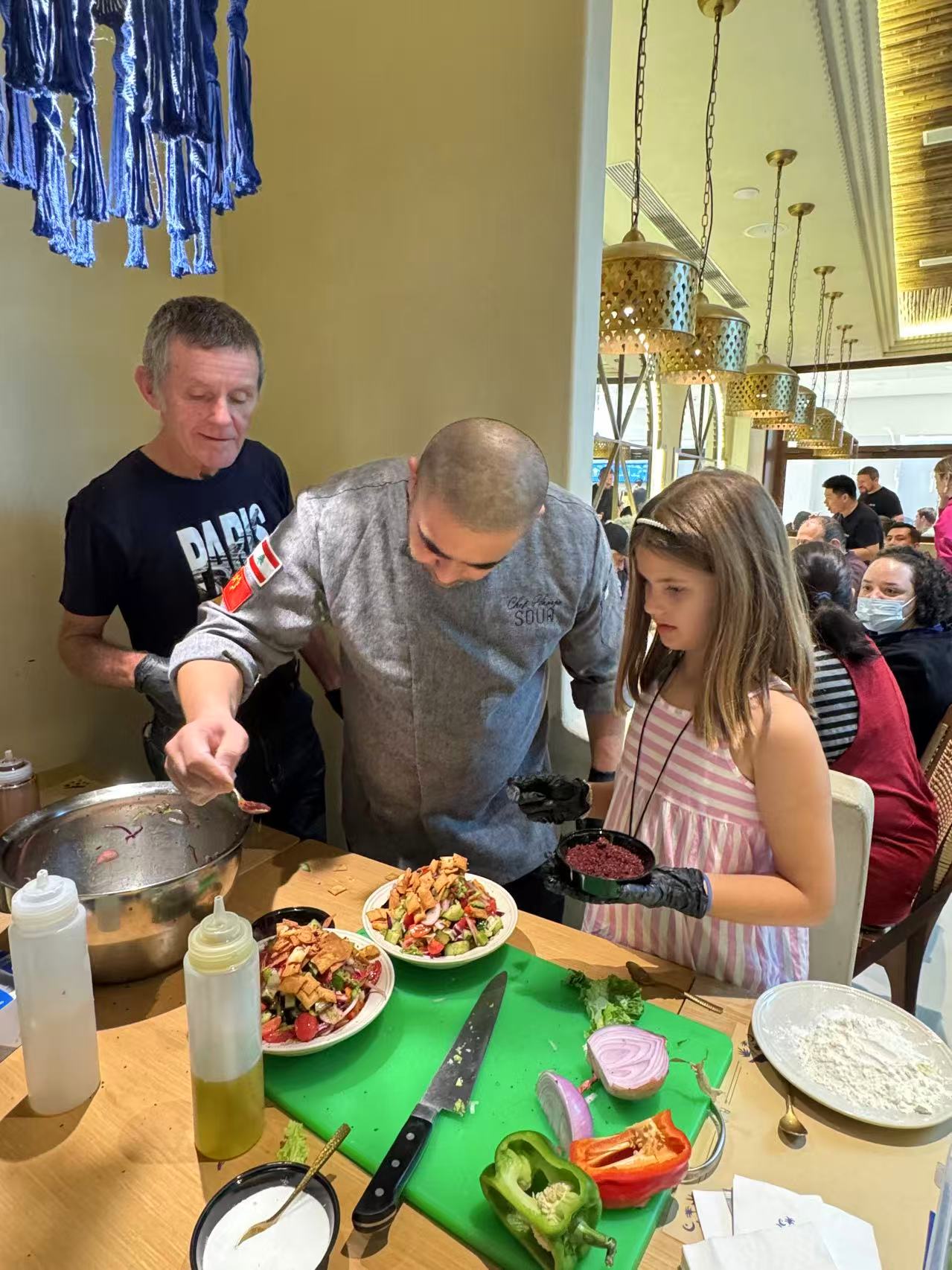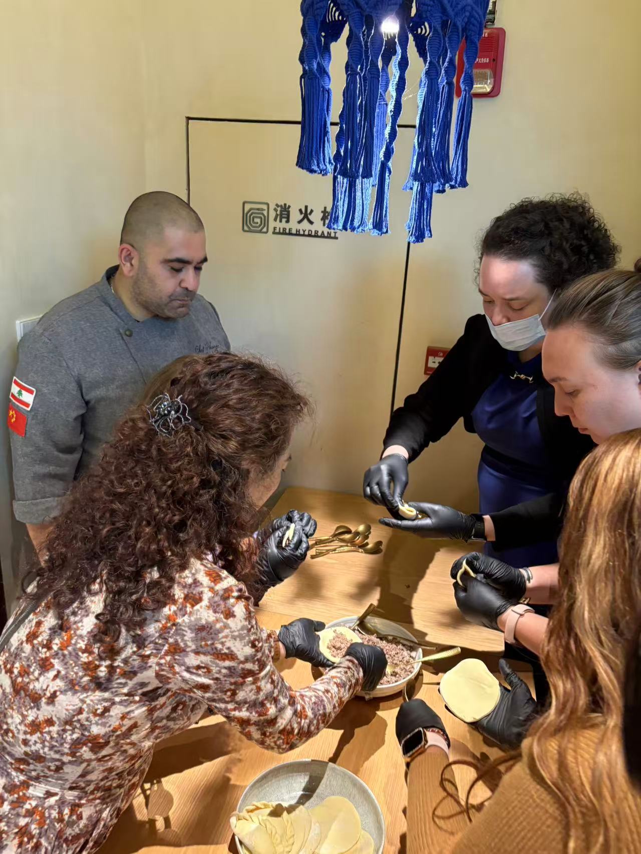 当晚的亮点之一是由Hamze主厨 带领的现场烹饪示范,他引导宾客共同制作传统黎巴嫩菜肴,包括鹰嘴豆泥(Hummus)、黎巴嫩沙拉(Tabbouleh)和肉丸(Kibbeh)